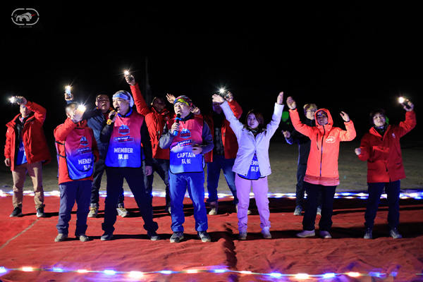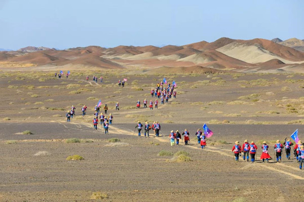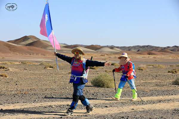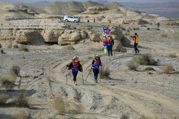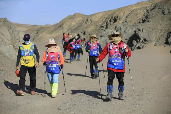 第一天是8小時(shí)25公里,牛商們在太陽還沒完全升起來就開始了遠(yuǎn)征前的熱身,原力專業(yè)的教練,激昂的樂章,鼓舞著雄心勃勃的牛商們,一聲號令全體出發(fā),萬馬奔騰的節(jié)奏開始了,彩旗飄飄,紅裝戰(zhàn)衣,藍(lán)色背包,熒光粉的名號牌,浩浩蕩蕩,塵土飛揚(yáng)!戈壁我們來了!