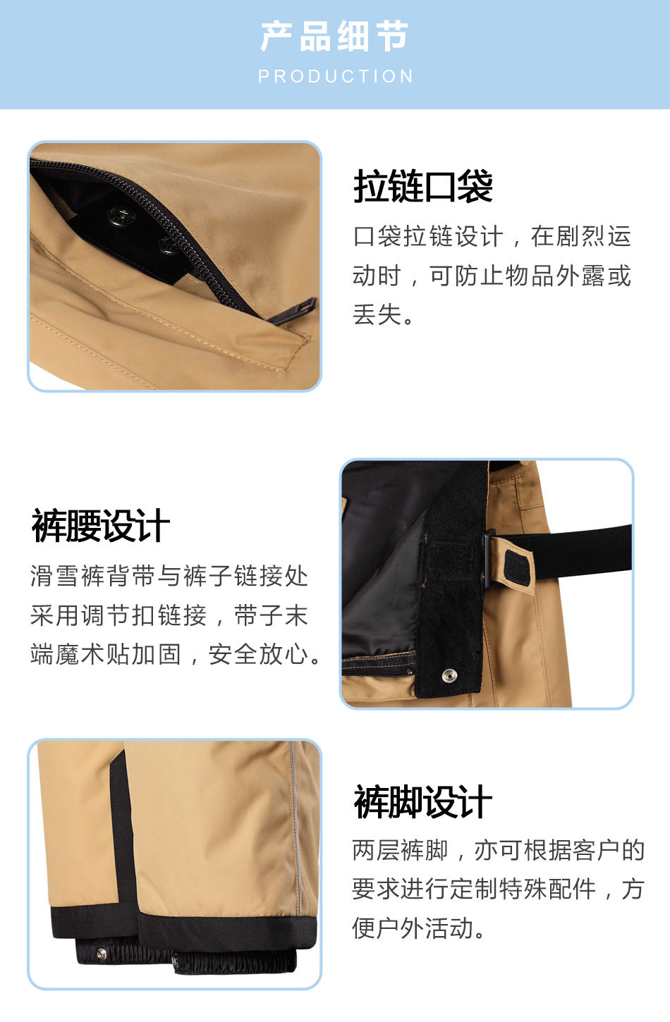 褲腰設(shè)計(jì):戶外滑雪褲加工的背帶與褲子鏈接處采用調(diào)節(jié)扣鏈接,帶子末端魔術(shù)貼加固,安全放心。